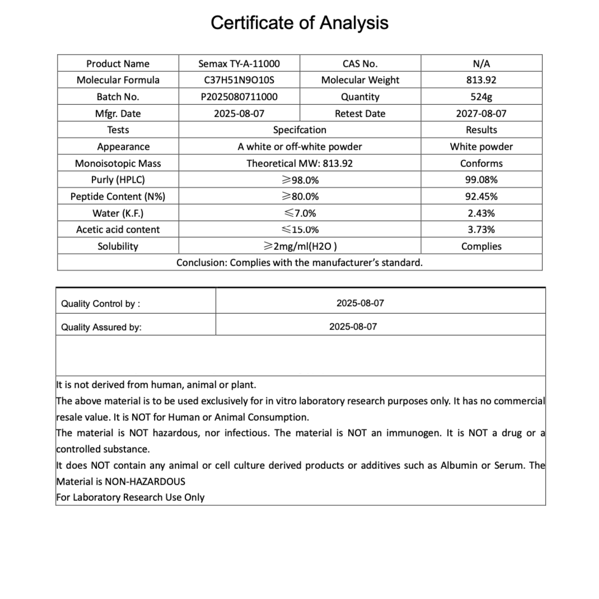 SEMAX is a synthetic peptide available in a 5mg lyophilized powder format, intended exclusively for laboratory and scientific research. This product is not for human or veterinary use.